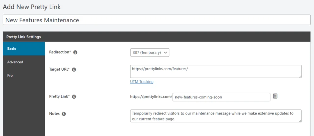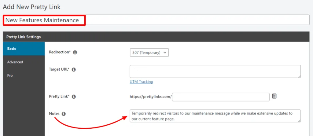 Give your pretty link redirect a title that helps define its purpose. If needed, you can also include additional details in the notes section for further explanation: