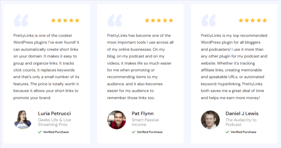 These testimonials share how real users are using the PrettyLinks WordPress plugin to strengthen their affiliate strategies in ways that fit their goals, audiences, and content.