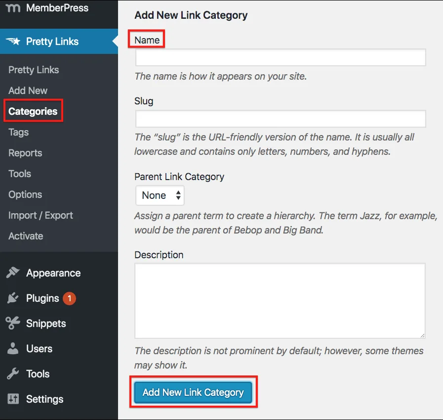 Es gibt 2 Möglichkeiten, eine Kategorie hinzuzufügen. Die erste Möglichkeit besteht darin, in Ihrem WordPress-Dashboard auf die Registerkarte PrettyLinks -> Kategorie zu gehen. Dann müssen Sie das Formular ausfüllen, indem Sie der Kategorie einen Namen geben und alle anderen Informationen, die Sie wünschen, ausfüllen. Wenn Sie den Slug leer lassen, wird er automatisch genauso wie der Name erstellt. Klicken Sie anschließend auf die Schaltfläche "Neue Link-Kategorie hinzufügen", um die Kategorie zu erstellen.