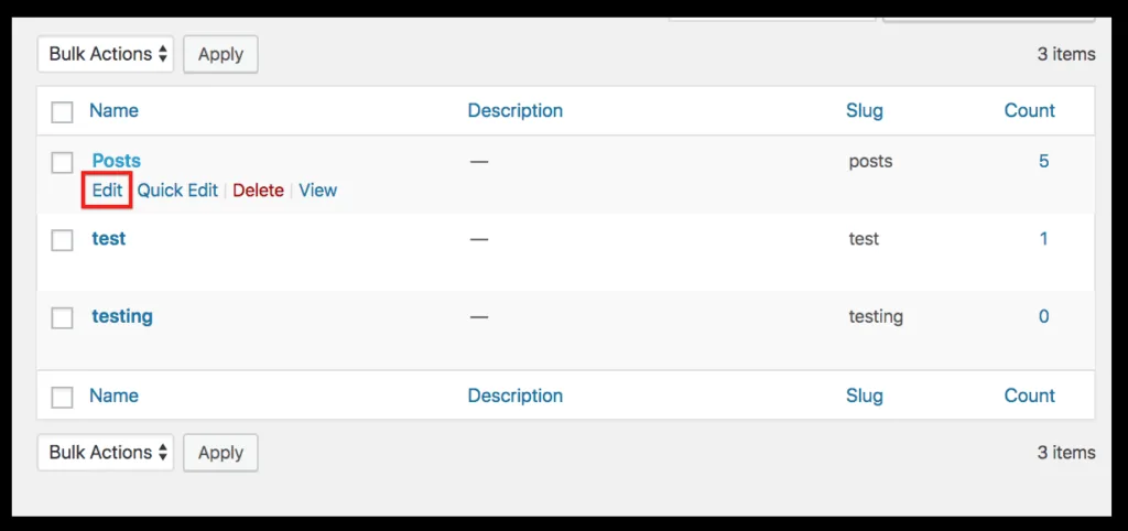 Um eine Kategorie zu bearbeiten, müssen Sie in Ihrem WordPress-Dashboard auf die Registerkarte PrettyLinks -> Kategorien gehen. Bewegen Sie dann den Mauszeiger über die Kategorie, die Sie bearbeiten möchten, und klicken Sie auf Bearbeiten.