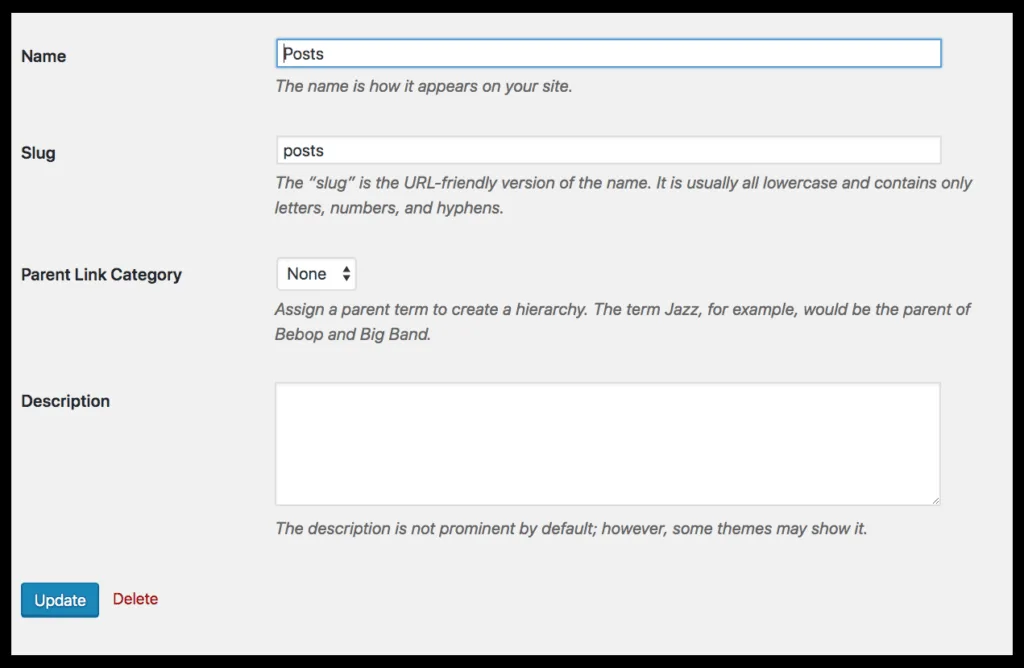 Sie werden dann auf eine Seite weitergeleitet, auf der Sie die Informationen über die Kategorie ändern können, einschließlich des Namens, des Slugs, der übergeordneten Linkkategorie und der Beschreibung. Klicken Sie nach der Bearbeitung auf Aktualisieren, um die Änderungen zu speichern.