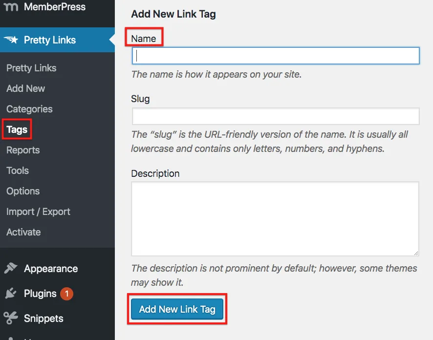 Um einen neuen Link-Tag hinzuzufügen, gehen Sie in Ihrem WordPress-Dashboard zu PrettyLinks -> Registerkarte Tags. Dann müssen Sie das Formular ausfüllen, indem Sie den Tag benennen und alle anderen gewünschten Informationen eingeben. Wenn Sie den Slug leer lassen, wird er automatisch mit demselben Namen erstellt. Klicken Sie anschließend auf die Schaltfläche "Add New Link Tag", um das Tag zu erstellen.