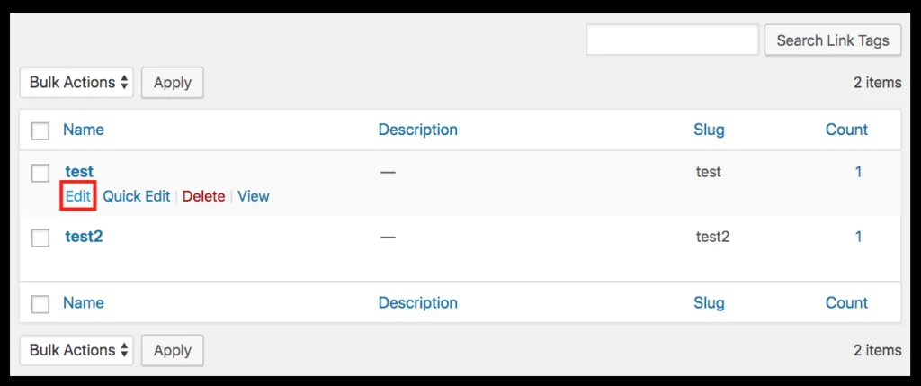 Um ein Tag zu bearbeiten, müssen Sie in Ihrem WordPress-Dashboard auf die Registerkarte PrettyLinks -> Tags gehen. Bewegen Sie dann den Mauszeiger über den Tag, den Sie bearbeiten möchten, und klicken Sie auf Bearbeiten.