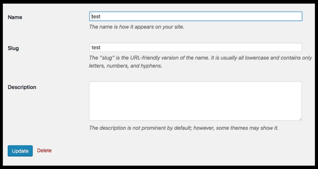 Sie werden dann auf eine Seite weitergeleitet, auf der Sie die Informationen zum Tag ändern können, einschließlich Name, Slug und Beschreibung. Klicken Sie nach der Bearbeitung auf Aktualisieren, um die Änderungen zu speichern.
