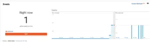 Wenn die vorherigen Schritte abgeschlossen sind, sendet MonsterInsights Tracking-Daten an Google Analytics, wo Sie die Klicks in Echtzeit sehen können. Dies können Sie auf Ihrer Google Analytics Kontoseite sehen unter https://analytics.google.com > Berichte > Echtzeit > Registerkarte Ereignisse. Um dies zu testen, klicken Sie einfach in einem Inkognito-Fenster auf alle hübschen Links auf Ihrer Website, die den von Ihnen erstellten Basis-Slug haben. Hier ist ein Beispiel dafür, wie dies in Google Analytics in Echtzeit aussehen könnte.