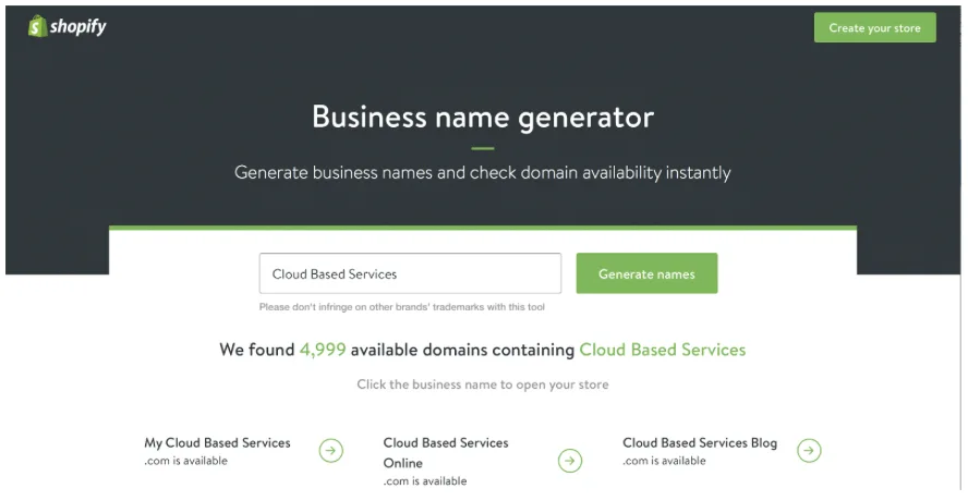 - Generador de nombres de empresa de Shopify. Esta herramienta generará los nombres de dominio disponibles basándose en las palabras clave que introduzcas. A continuación, puede optar por reservar su dirección de marca directamente a través de Shopify.