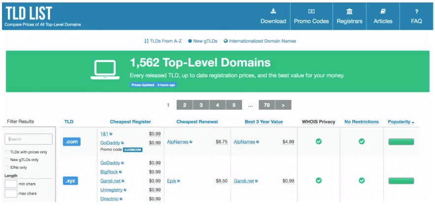 Por supuesto, los distintos registradores de dominios ofrecen precios diferentes. A veces, la misma vanity URL puede costar menos en otro registrador, así que lo mejor es comparar precios. Sitios como Lista de TLD le facilita las cosas ofreciéndole una comparación exhaustiva de los dominios de primer nivel: