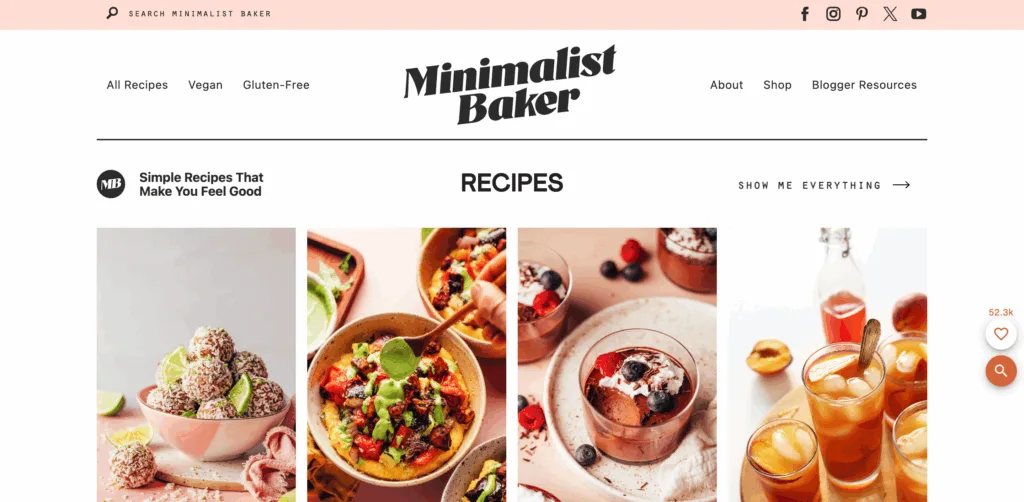 MinimalistBaker.com comunica inmediatamente lo que ofrece el sitio: recetas sencillas, sin ingredientes innecesarios y un enfoque centrado en la cocina. El nombre es claro, específico y fácil de buscar.