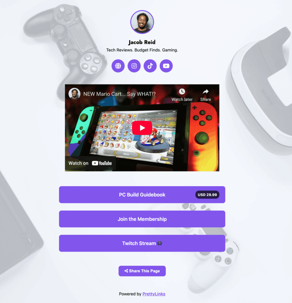 This example comes from a creator in the gaming space who’s using his Link In Bio page as a central hub for content, products, and community.