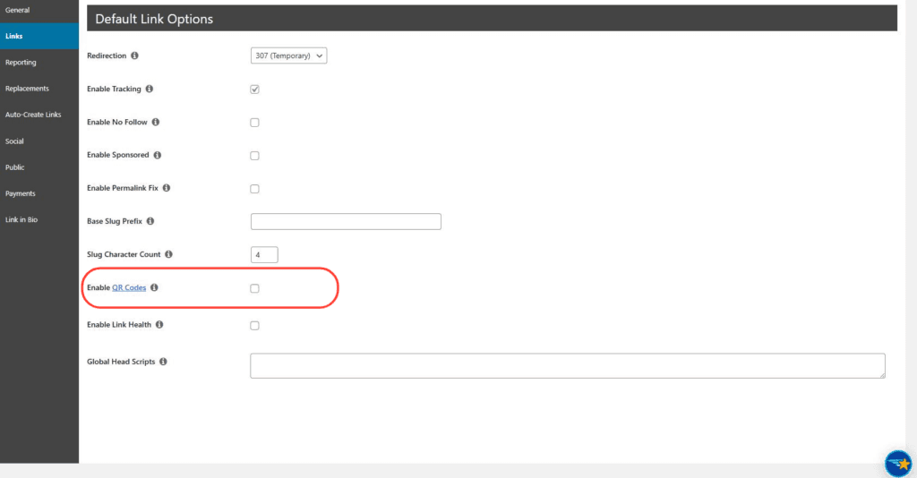 Para activar los Códigos QR, dirígete a PrettyLinks > Opciones > Enlaces. Allí verás la siguiente opción disponible. Marca la casilla y guarda las opciones: